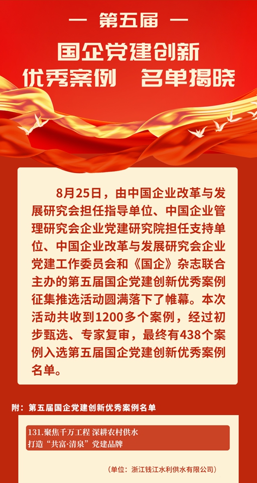 近日,第五屆國企黨建創新優秀案例名單揭曉,錢江水利開發股份有限公司下屬錢江供水“共富·清泉”黨建品牌入選。 此次活動由中…